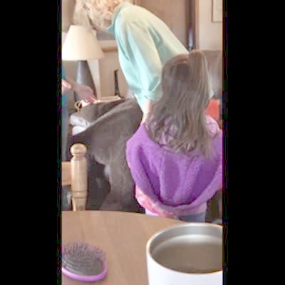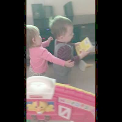 Two young girls dance on a couch. When they hug at the end they fall off while in each other's arms. Music rights not cleared.