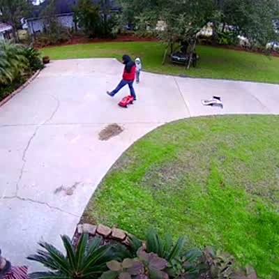 A man steps over his young son's remote controlled truck while the boy drives the truck on a sidewalk. The truck hits the man's leg and he falls on top of the toy and breaks it. The boy cries over his broken toy while the man lays on the ground and hugs the boy. ring.com security camera footage.