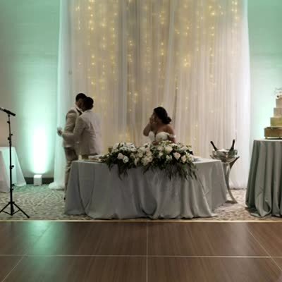 A man finishes a Best Man speech at a wedding, and as he hugs the bride and groom the backdrop falls on them and onto the cake. Reception.