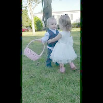 A young boy gives a young girl a Valentine's Day card and flowers. They hug each other and then fall over a single step that leads to the sunken dining room. They fall hard on the dining room floor and cry.