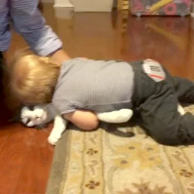 A tot girl hugs a tot boy from behind in the living room and accidentally pulls him backwards and he falls on her.