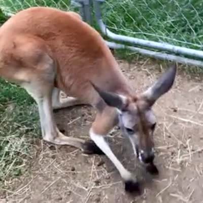 A kangaroo at a wildlife park copies a teen boy while he scratches his stomach.