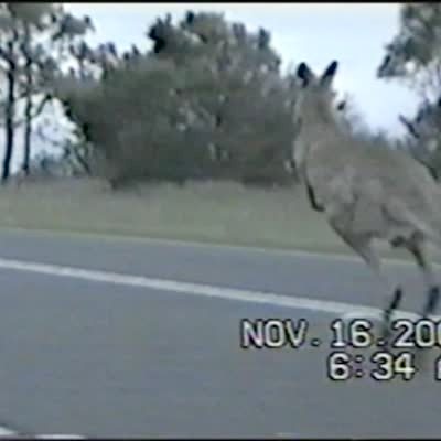 A teen girl reaches out her hand to feed a kangaroo, then runs when it chases her. Featured talent cleared only (the young woman being chased by the kangaroo).