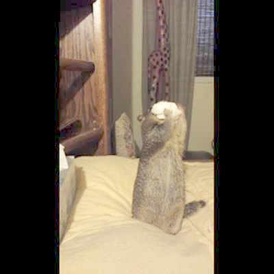 A pet squirrel takes tissues out of a Kleenex box on a bed indoors and stuffs them in its mouth.