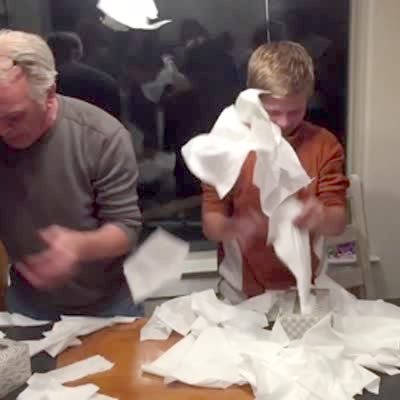 A table collapses in the dining room when a man leans over it to grab a box of tissues while he and a teen boy race to see who can pull all of the Kleenex out of their boxes first.