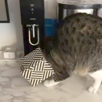 A cat on a counter has his head stuck in a Kleenex box. He walks backwards. The counter ends and the cat falls.