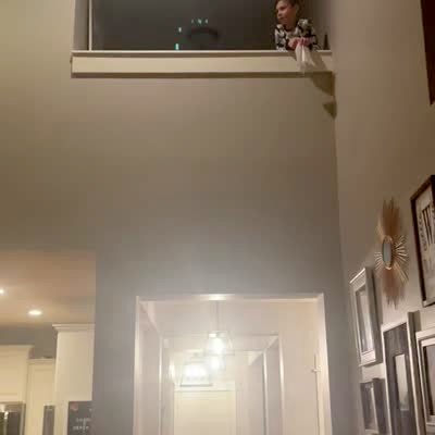A teen girl throws a tissue off a balcony in the house. She quickly runs down the stairs and catches the tissue before it hits the ground.