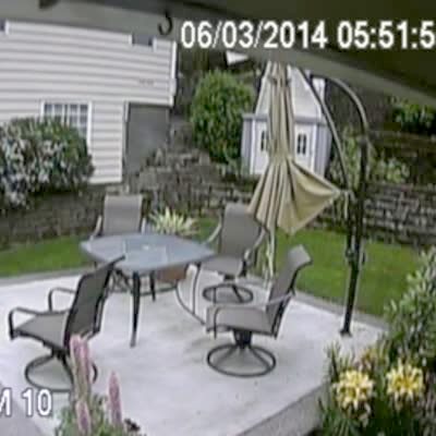 A woman sprays a wasp on a deck, but she avoids it and bumps into objects before she throws the can and runs away. Security footage.