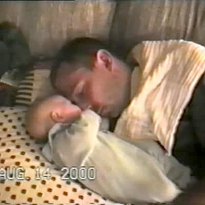 Baby boy sleeps straight through Dad's loud snoring. They are nose to nose. Cute.