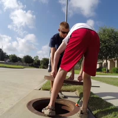 A teen by slips and nearly falls into a sewer outdoors after lifting the lid.
