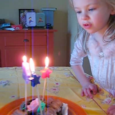 "Birthday Candle Recount" Young girl sits in front of birthday cake with a number 4 candle in it. Girl tells camera woman that she's actually 5. Camera woman laughs because she forgot. Girl blows out candles.