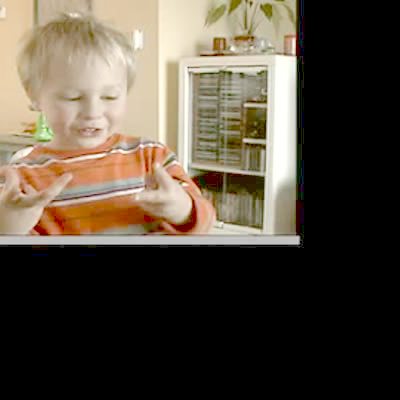 A young girl does a magic trick in a living room in which she holds up cards and her father guesses them. He always guesses correctly, because her younger boy brother holds up his hands to share the number behind her back. The young girl yells "how do you do that?"