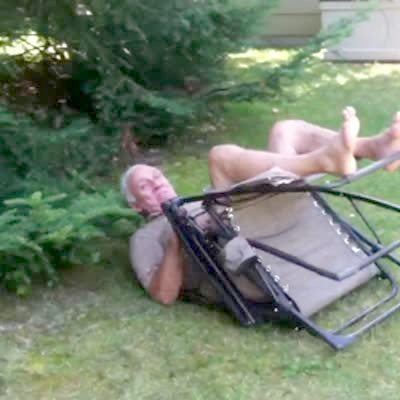 A senior man struggles to get out of a gravity chair/ lawn chair he falls backwards rolls over and asks "What's the number for 911?"