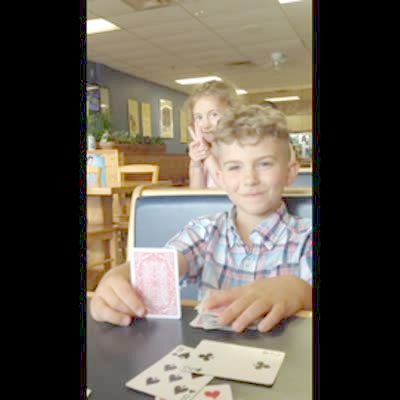 A boy turns over playing cards indoors and his sister stands behind him and tells his dad what number is on the card. The boy gets frustrated each time his dad guesses what number is on the card.