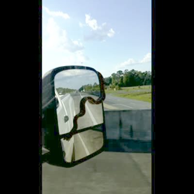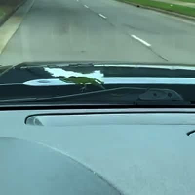 A gecko lizard jumps around on the hood of a man's car while the man drives down the street. The man yells every time it jumps. Then the gecko lands on the driver's side window.