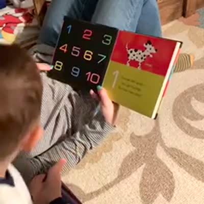 A young boy reads a book of numbers in the living room. He flips over the book and calls the number nine a six.