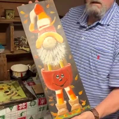 A senior man holds up a painted Halloween gnome decoration during a live auction at home, then he farts loudly, and a senior woman says "come on" off-camera.