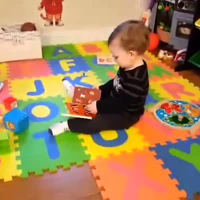 The man with the camera asks a tot boy about different numbers and letters in the living room and the boy points to them in his books or on his mat. The man asks him where "P" is and the boy points to his groin.