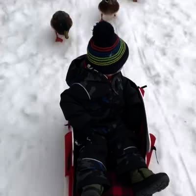 A man pulls a young boy around outside in a sled, and a large number of ducks follow them.