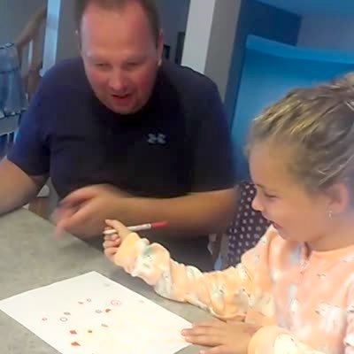 A man at a kitchen table says his young girl daughter can do a magic trick where he writes a number and she can circle the number with her eyes closed. She circles on a piece of paper and then he writes in the number afterwards and pretends she correctly circled the number. She doesn't know how she is doing it.