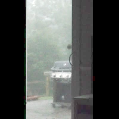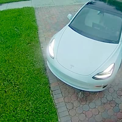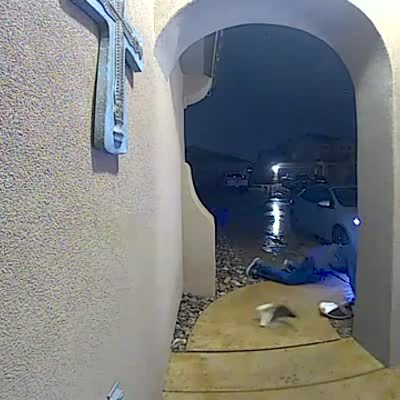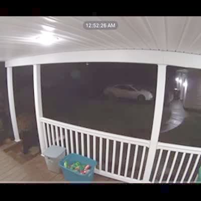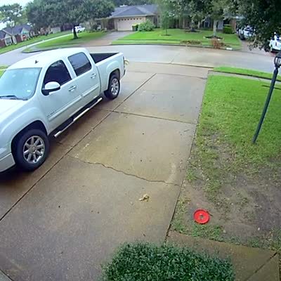 A man runs out to a car in the rain, then slips and breaks a pot in the front yard. Security footage.