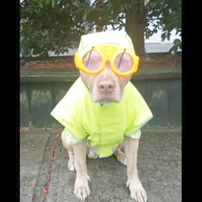 A dog looks at the camera while it wears a raincoat and glasses with wipers. Costume