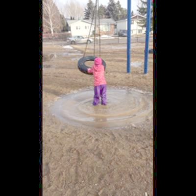 Two teen girls balance on swings during a rain storm. One teen girl falls off the swing and lands a large puddle of water.