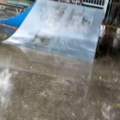 A man hits his gutter with a shovel and water pours out all over him. Security footage.