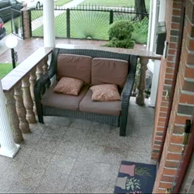 A man stands on a porch and looks out at a storm. He tries to run out to his car, but he immediately slips and falls. Security footage.