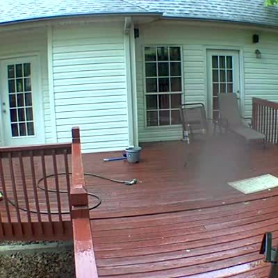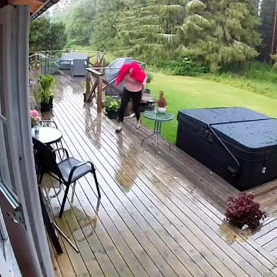 A woman falls down the stairs of her deck in the rain. Security Camera Footage.