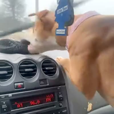 A dog's head follows the wipers across a windshield. It stands on the dashboard and beings to bark at the wipers.