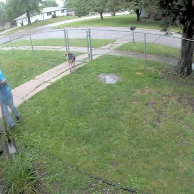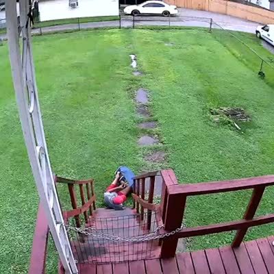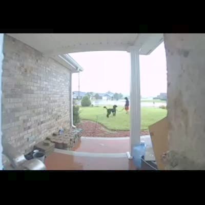 A young boy takes a poodle dog into a front yard, then thunder strikes and the dog sprints back to a front door. Security camera footage.