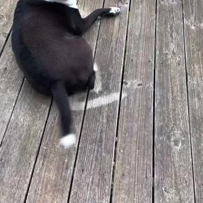 A woman asks a dog if he's in the rain and when he stands up on the patio you can see the dry outline of his body, including his tail and paws, on the wet wood.