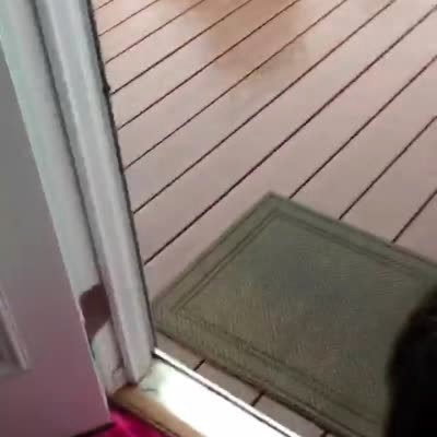 A woman lets her dog out to go pee, and the dog runs outside and immediately runs back in when he sees the rain.