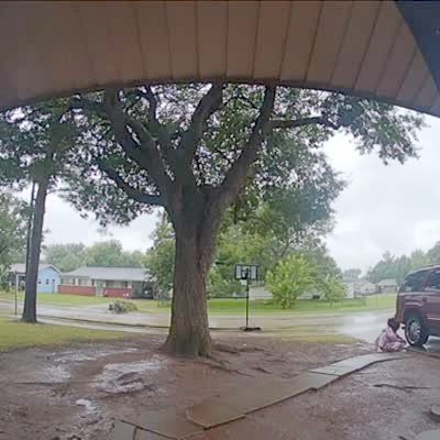 A woman with two young girls walks with them down the driveway under an umbrella in the rain. When lightning flashes, the woman turns and runs into the garage, leaving her children in the rain. Security footage
