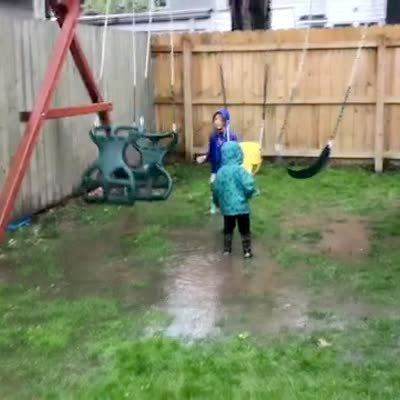 A young boy stands in a puddle in front of a swing set in the yard. A young girl pushes one of the swings and it hits the boy in the face causing him to fall in the puddle.