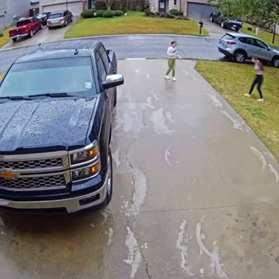 A woman slips and falls as she gets out of a truck on the driveway. Security footage.