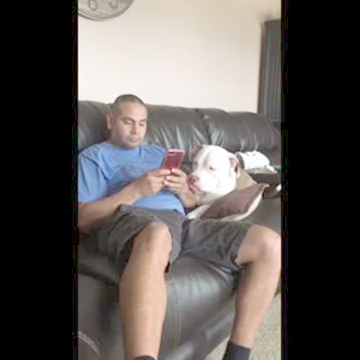 A man looks through his phone while he sits on a couch in the living room and a dog sits next to him and swats at his phone to push it away so that the man will pay attention to it instead of his phone.