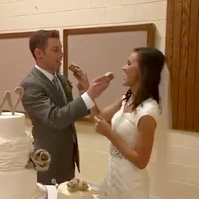 A bride and groom feed each other wedding cake, but the groom shoves it in the bride's mouth and she falls down indoors.