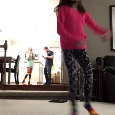 A young girl dances, her sister runs up behind her and pushes her out of frame. She falls to the ground.