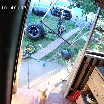 The moment a woman turns around, a young boy outside pushes his younger brother on a swing and the whole swing set falls over. The mom comes back outside to help. Security Footage.