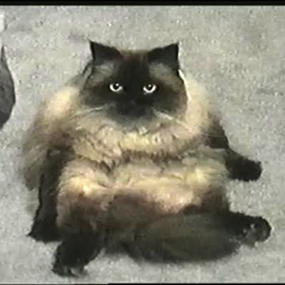 Siamese cat on red bed sheets jumps up and hisses when man startles / scares him.