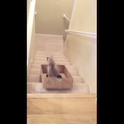 A Siamese cat rides down stairs in a box indoors. No sound.