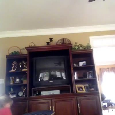 A woman stands on her husband's back while he lies down in a living room, then he gets up onto his hands and knees for a viral challenge, and she falls on his head as music plays. Music rights not cleared.