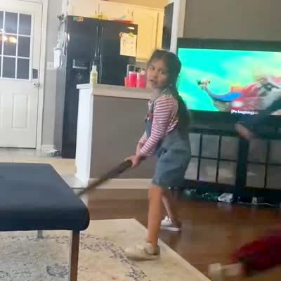 A young girl swings a stick and breaks the TV in the living room.