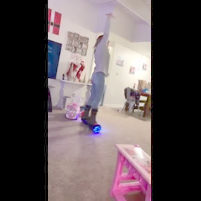 A woman rides a hoverboard in the living room and then falls back into the TV.