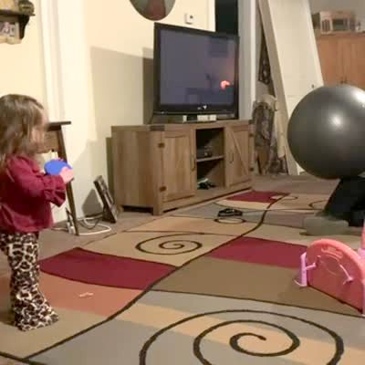 A man throws an exercise ball at a tot girl and it hits her face and she falls.