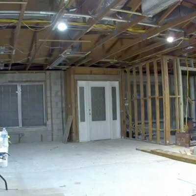 A man tries to attach a bungee cord to a television on the ceiling of a basement. The cord snaps and hits him, and gets caught in the back of his shirt making it difficult for him to get "unstuck." Security footage.