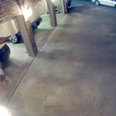A woman trips and falls forward when she walks out to her car in the driveway. She lands with her aims splayed out, then stands and unlocks her car. Nighttime. Home security footage. No audio.