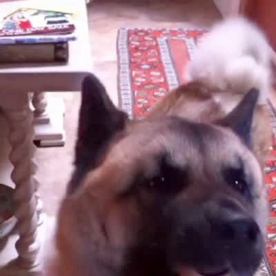 "Hollow Tube Howler" A dog growls indoors with a toilet paper cardboard roll in his mouth, and starts to howl through it. Cute.